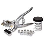 Tatuador importado (made in USA), da marca STONE, em liga de alumínio especial super leve e resistente. Segura até quatro dígitos (10 mm) em cada lado da cabeça giratória num total de OITO dígitos. Com liberação automática de orelha. Inclui 01 jg. de n.º 0-9 e 01 pote de tinta preta. Em repetições de números como 22, 222 é nescessário adquirir dígitos extras.